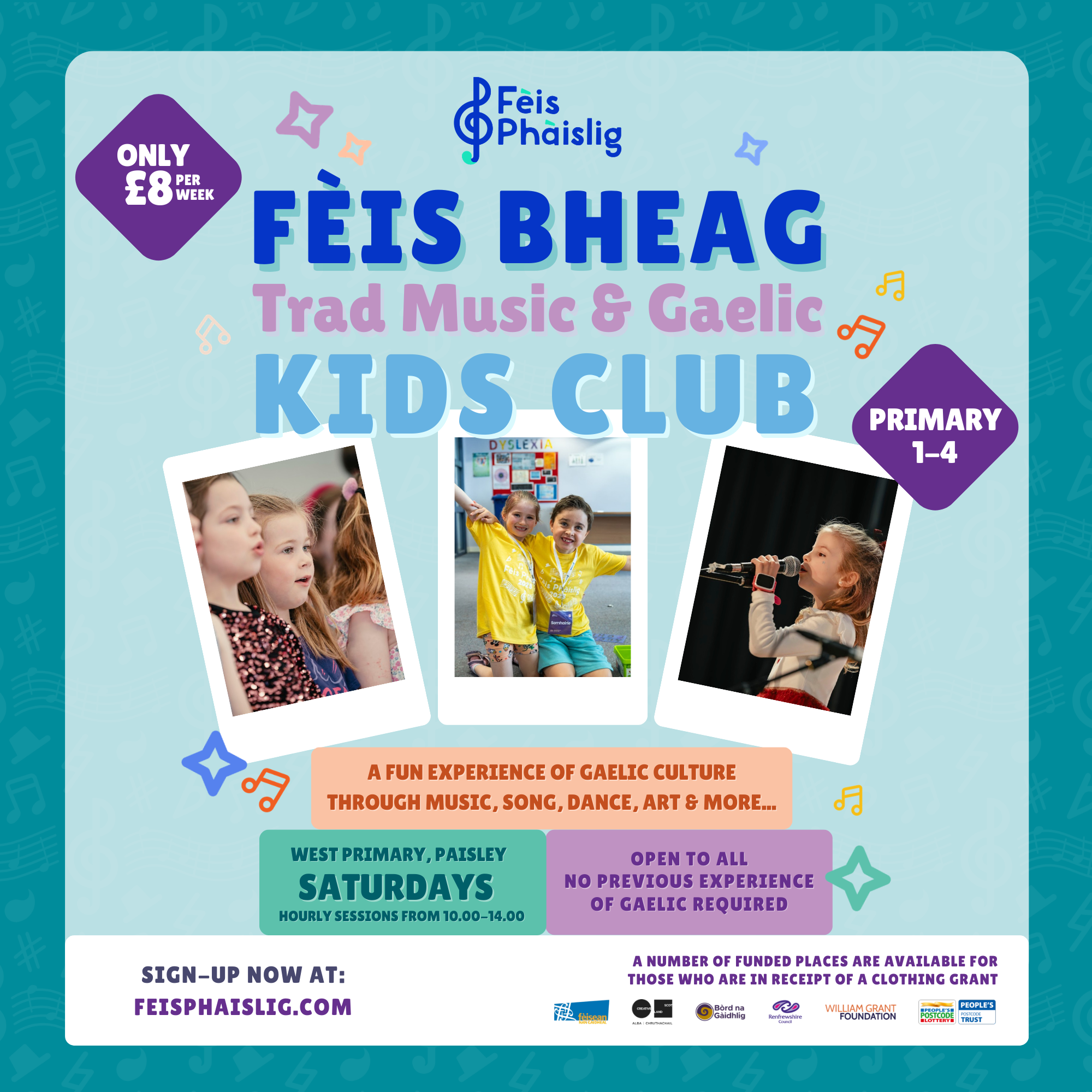 Fèis Bheag runs every Saturday during term time at West Primary School in Paisley from 10am-1.50pm. Sessions last for approx. 50 minutes and run on the hour from 10am-1pm as follows: