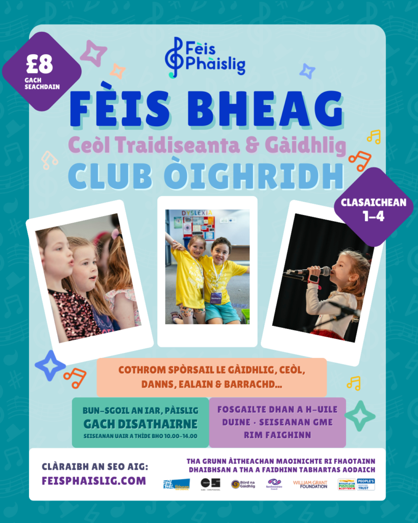 We have a few places available in our weekly Fèis Bheag (Wee Fèis) classes. These fun and engaging sessions introduce children P1-P4 to traditional music and Gaelic culture through music, song, dance and art and more!